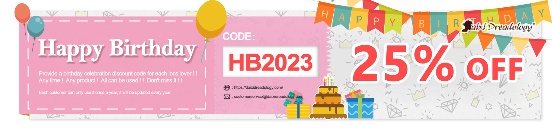 Provide a birthday celebration discount code for each locs lover ! !Any time ! Any product ! All can be used ! ! Don't miss it ! !Each customer can only use it once a year, it will be updated every year.