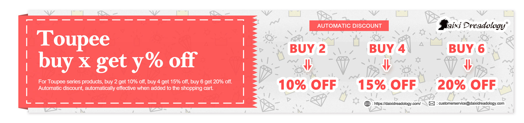 For Toupee series products, buy 2 get 10% off, buy 4 get 15% off, buy 6 get 20% off. Automatic discount, automatically effective when added to the shopping cart.