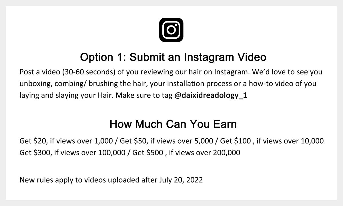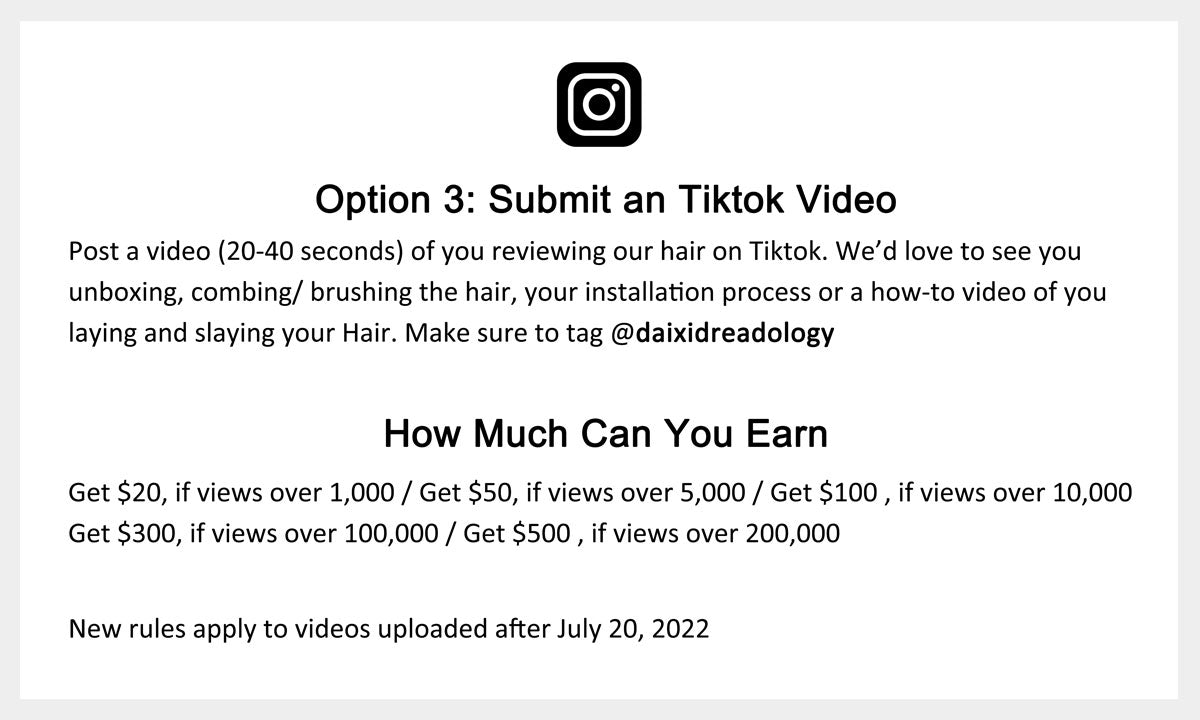 In addition to post videos, you can also post photos and blogs on the above four social media,it still have reward. If views over 2000, we will send a supplementary package that is consistent with the product you ordered. If your photo is chosen to use as a product picture, a free hair will definitely rewarded back. Please keep tuned to get Daixidreadology's hair for free.